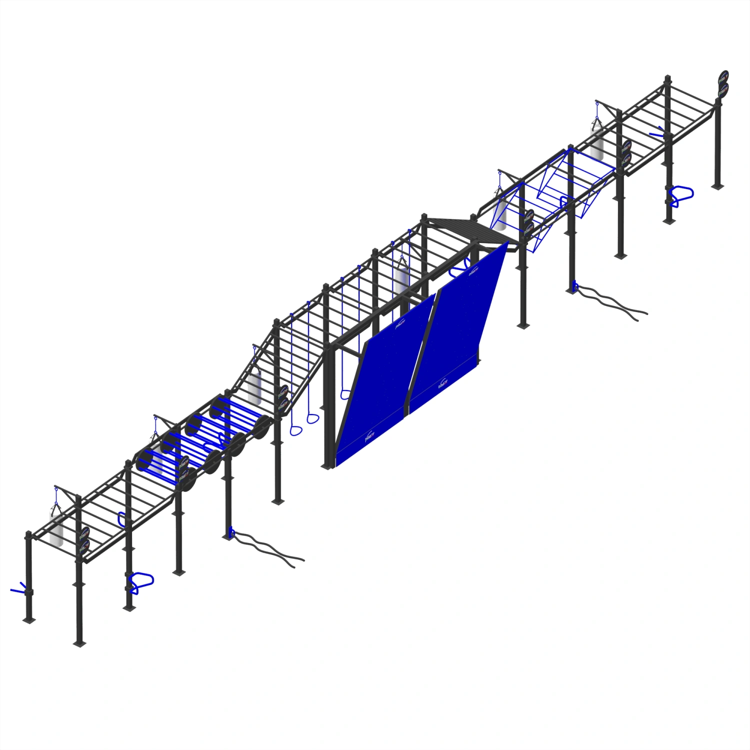 Esta estructura multiplataforma está diseñada como un recorrido lineal, continuo y altamente técnico, perfecto para un entrenamiento completo de fuerza, coordinación, resistencia y agilidad. A lo largo del primer tramo hay barras horizontales flanqueadas por sacos de boxeo suspendidos, ideales para combinar el trabajo de suspensión y los golpes dinámicos. Inmediatamente después, dos grandes rampas inclinadas con peldaños ofrecen un desafío vertical que estimula la potencia explosiva y el control del cuerpo. La parte central está diseñada para un entrenamiento avanzado de agarre, con anillas suspendidas, cuerdas lisas y de anillo, balas de cañón y módulos de bolas verticales, que requieren precisión y fuerza en el agarre. A esto le siguen los asideros giratorios y las secciones técnicas para transiciones dinámicas y obstáculos suspendidos por OCR. Los objetivos verticales a golpear se distribuyen a lo largo de toda la longitud, barras paralelas bajas para fondos, ganchos para bandas elásticas y plataformas para ejercicios complementarios.