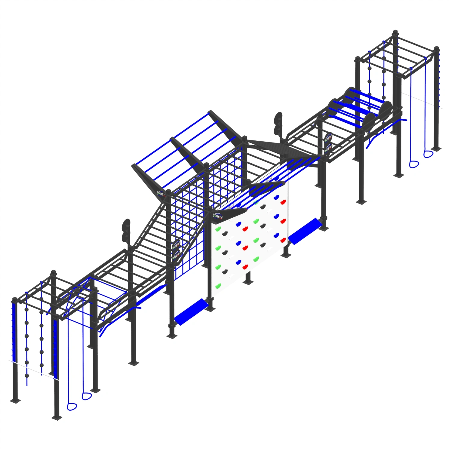 Esta estructura para el entrenamiento de obstáculos y ninjas se compone de una combinación de elementos de alta funcionalidad. Incluye cuerdas de escalada, bolas de agarre colgantes, barras de mono horizontales e inclinadas, rejillas verticales de escalada de acero, una rampa oblicua con barras transversales de dominadas cuesta arriba y una espectacular pared vertical con presas de colores. El sistema se completa con módulos con discos giratorios, anillos suspendidos, plataformas bajas, postes verticales y soportes laterales para oscilaciones y transiciones.
