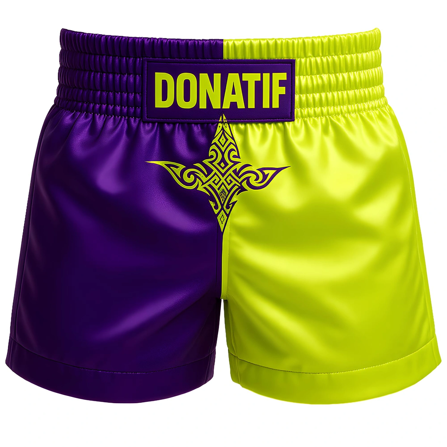 Confeccionados con un corte extralargo y ancho, cuentan con una entrepierna más espaciosa y un dobladillo con dobladillo que garantizan una total libertad de movimientos, incluso durante las fases más intensas y dinámicas del partido. También están diseñados para acomodar cómodamente una copa protectora de estilo profesional, lo que garantiza la máxima comodidad y protección. La explosiva combinación de morado oscuro y amarillo fluorescente le da a los pantalones cortos un poderoso impacto visual, un símbolo de energía y determinación. El detalle gráfico central y el logotipo DONATIF en contraste en la cintura completan un diseño único, diseñado para atletas que quieren destacar y dejar huella, dentro y fuera del ring.