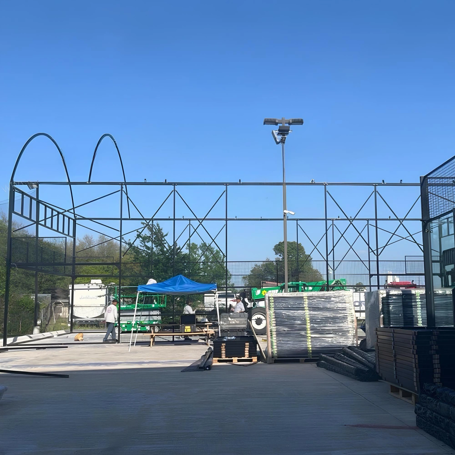 Los componentes incluyen materiales de alta calidad, como acero inoxidable 304, arandelas, pernos y accesorios de cristal, todos ellos diseñados para ofrecer la máxima seguridad y durabilidad. La pista está equipada con 46 paneles de malla de 1000×2000 mm, con una separación entre mallas de 50×50 mm y un grosor de 4 mm, enmarcados en tubos de 30×50 mm.