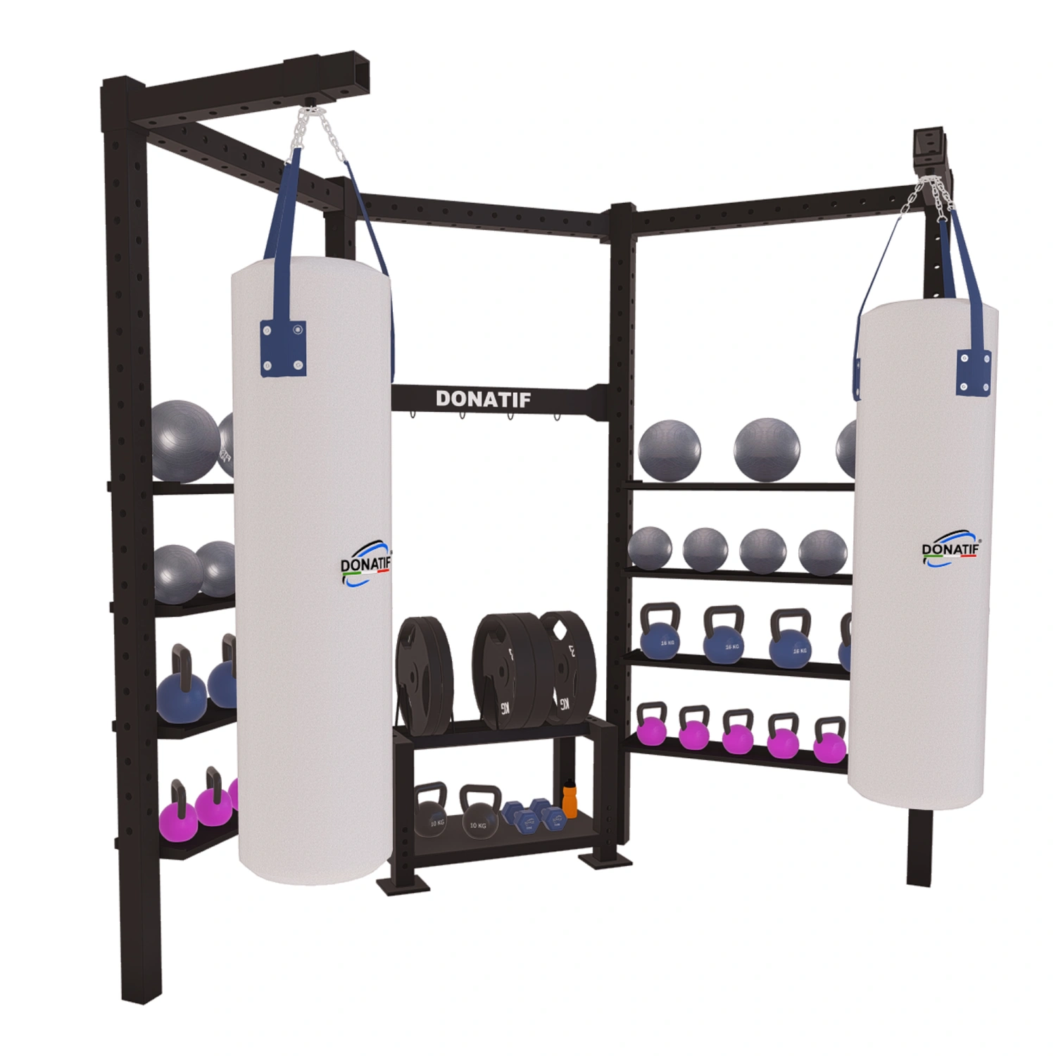 El tamaño y el peso de las bolsas son totalmente personalizables, así como todos los colores de la estructura y sus componentes. Gracias a la robustez de los materiales utilizados y al tratamiento de recubrimiento en polvo que protege contra el desgaste, las estructuras se pueden instalar tanto en interiores como en exteriores (sujetas a tratamiento de galvanizado en caliente bajo pedido), lo que garantiza durabilidad y seguridad en todas las condiciones. La gran superficie operativa, combinada con la presencia de varias estaciones, le permite estructurar un entrenamiento completo, dinámico y altamente personalizable.