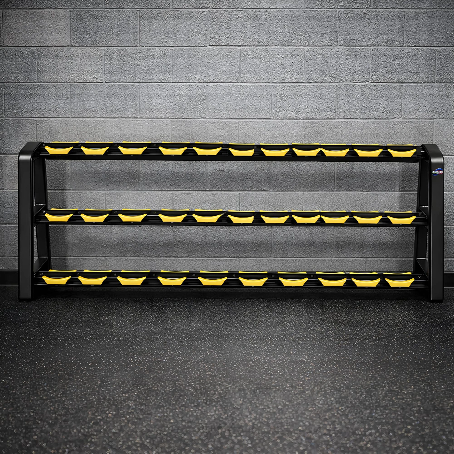 Nota: el nivel inferior está diseñado de forma que se encuentra a sólo unos centímetros del suelo, proporcionando espacio adicional sin desordenar la sala. Una elección ideal para acomodar las mancuernas más pesadas, facilitando su agarre con seguridad.