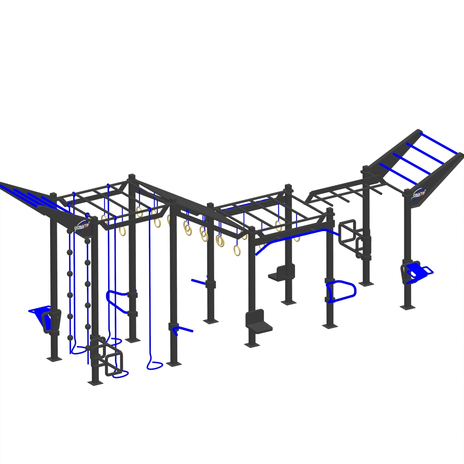 Avec de grandes dimensions – profondeur 720 cm, largeur 136 cm, hauteur 390 cm – et un poids total de 400 kg, cette station représente une solution complète et stable. Il intègre différents éléments : une barre de traction (120 cm de long et 33 mm de diamètre), des sections de barre de singe avec des pentes, des cordes d’escalade, des anneaux suspendus, des échelles verticales et des modules fonctionnels qui vous permettent d’entraîner la force, l’endurance et la coordination en un seul chemin.