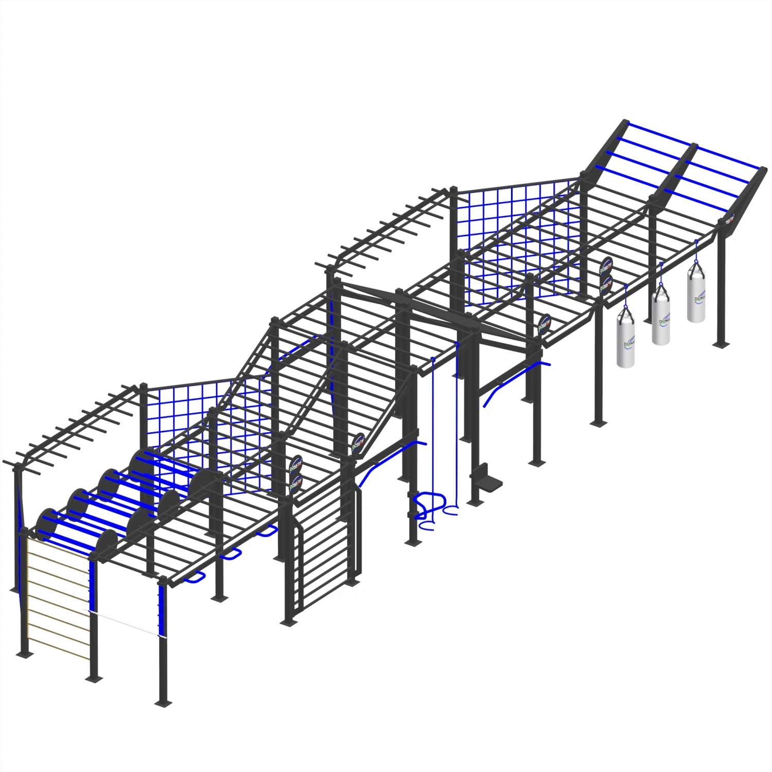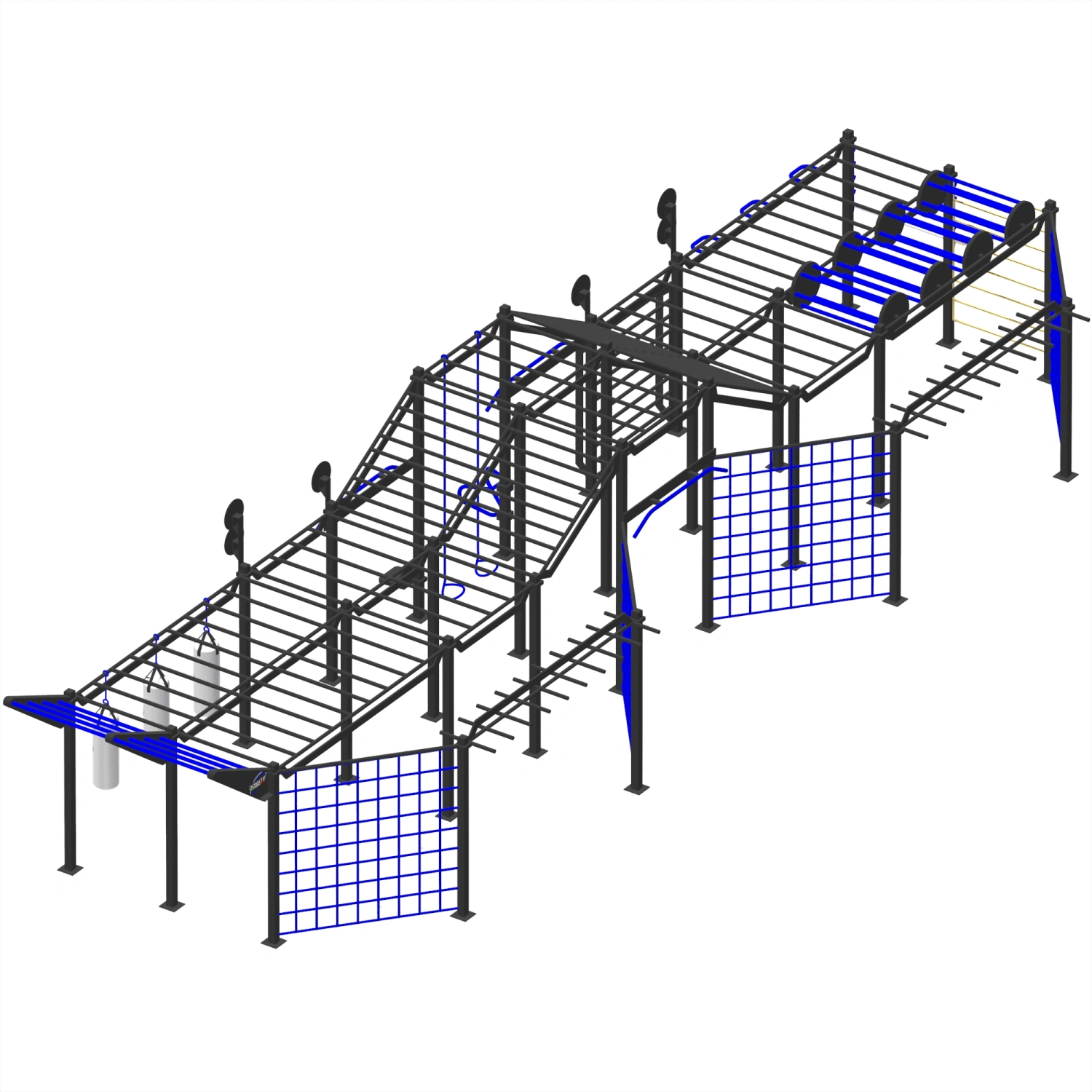 Cette structure modulaire est conçue pour offrir un parcours complet et hautement fonctionnel, idéal pour l’entraînement athlétique, militaire ou sportif de haut niveau. Construit en acier peint durable, il combine des éléments tels que des disques rotatifs pour la coordination, des filets et des grilles d’escalade, des barres de singe inclinées pour le développement de la force et des cordes verticales pour l’escalade au poids du corps. Il comprend des anneaux de suspension, des parois grillagées pour simuler des obstacles, des sacs de frappe pour l’entraînement à la frappe et de nombreux points d’ancrage pour les accessoires. Chaque section est conçue pour stimuler des capacités physiques spécifiques de manière progressive et engageante. La conception modulaire permet une personnalisation et une adaptabilité maximales aux espaces extérieurs, ce qui en fait une solution complète, polyvalente et professionnelle pour ceux qui recherchent des performances élevées et un entraînement fonctionnel avancé.