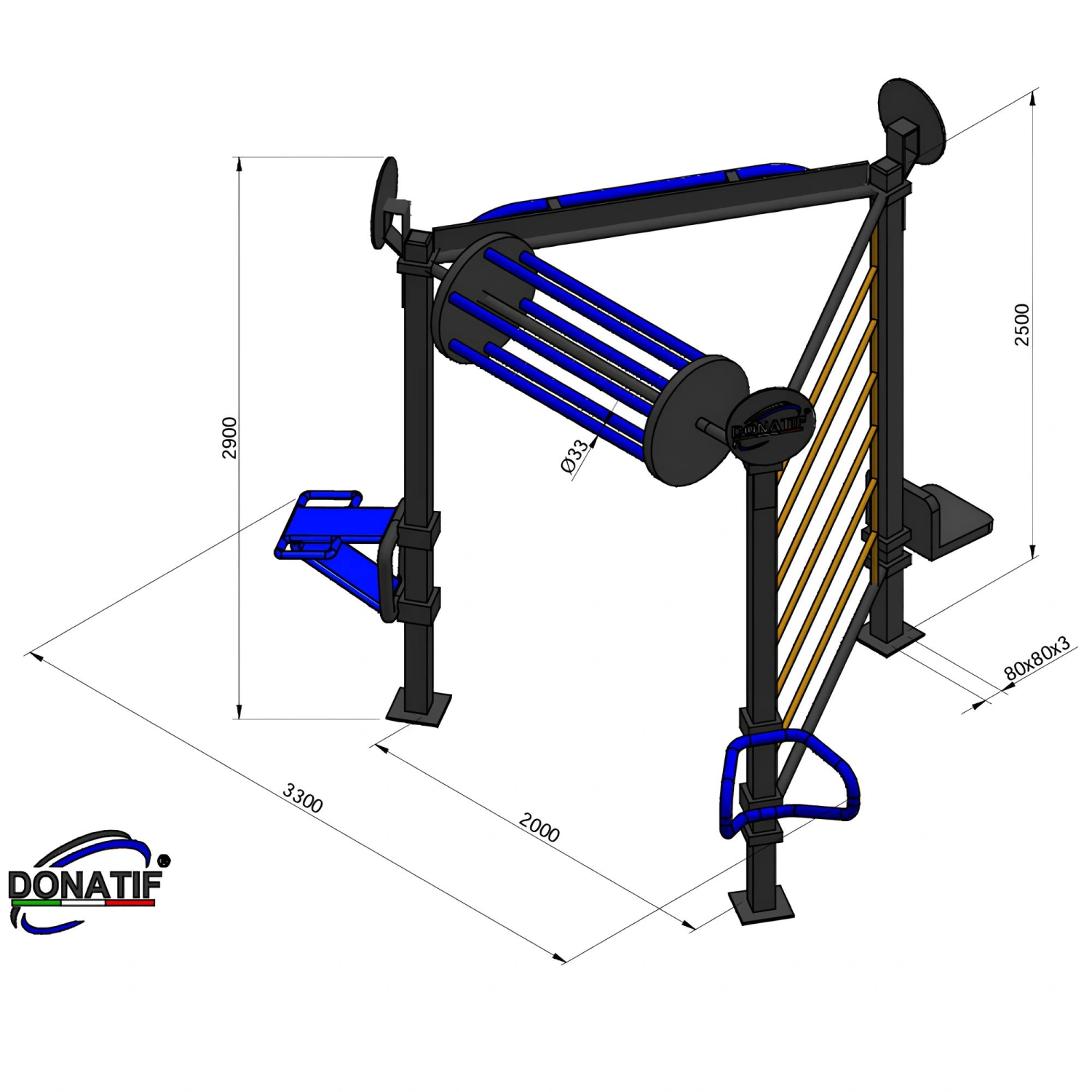 Indiquez les personnalisations que vous souhaitez et cliquez sur 'Enregistrer la personnalisation'La structure triangulaire de gymnastique suédoise - CH59 est une structure compacte mais complète, conçue pour assurer un entraînement fonctionnel et de gymnastique suédoise dans des contextes extérieurs. Fabriqué en acier avec un tube carré de 80x80x3 mm, galvanisé à chaud et revêtu de poudre, il résiste au temps et aux agents atmosphériques. Avec des dimensions de 330 cm de profondeur, 330 cm de largeur et 290 cm de hauteur, et un poids de 130 kg, il allie stabilité et facilité d’installation. Parmi les principaux composants, citons les barres de traction de 120 cm (diamètre 33 mm), les rouleaux rotatifs pour la préhension et la musculation des avant-bras, les barres murales verticales idéales pour les étirements et la gymnastique fonctionnelle, ainsi que les poignées de pompes, les stations de trempage et les stations latérales qui élargissent la gamme d’exercices disponibles.