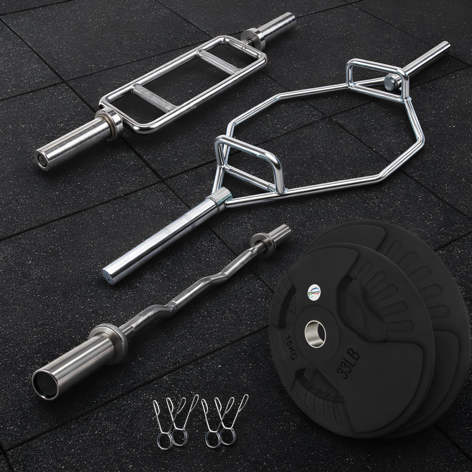 L’ensemble d’haltères olympiques avec 70 kg de disques caoutchoutés est un kit complet conçu pour ceux qui souhaitent s’entraîner professionnellement, à la fois en salle de sport et à la maison. Cet ensemble comprend :
