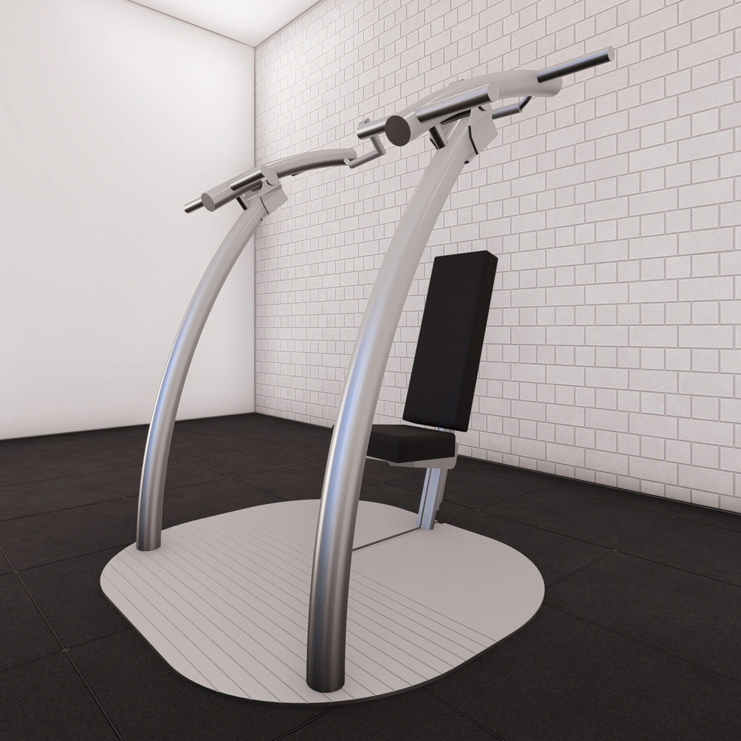 La fixation au sol s’effectue au moyen de chevilles incluses dans la livraison. Deux bras principaux en tube rond (Ø 100 mm, épaisseur 5 mm) s’élèvent jusqu’à 170 cm, avec une légère courbure. Deux bras plus courts sont attachés à ceux-ci qui permettent d’effectuer l’exercice convergent Lat Machine, optimisant ainsi le travail des lats.