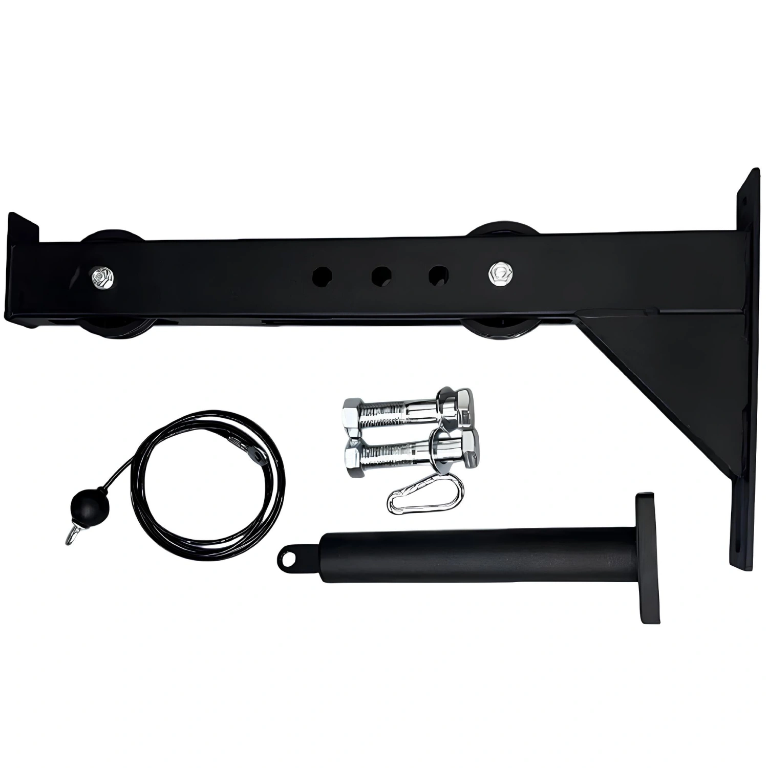 Le kit comprend également un câble en acier revêtu, avec des bornes à œillets et une boule de sécurité en caoutchouc noir. Cet élément se glisse à l’intérieur des poulies et peut être utilisé pour des mouvements de traction, de levage ou fonctionnels, assurant fluidité et contrôle à chaque étape.