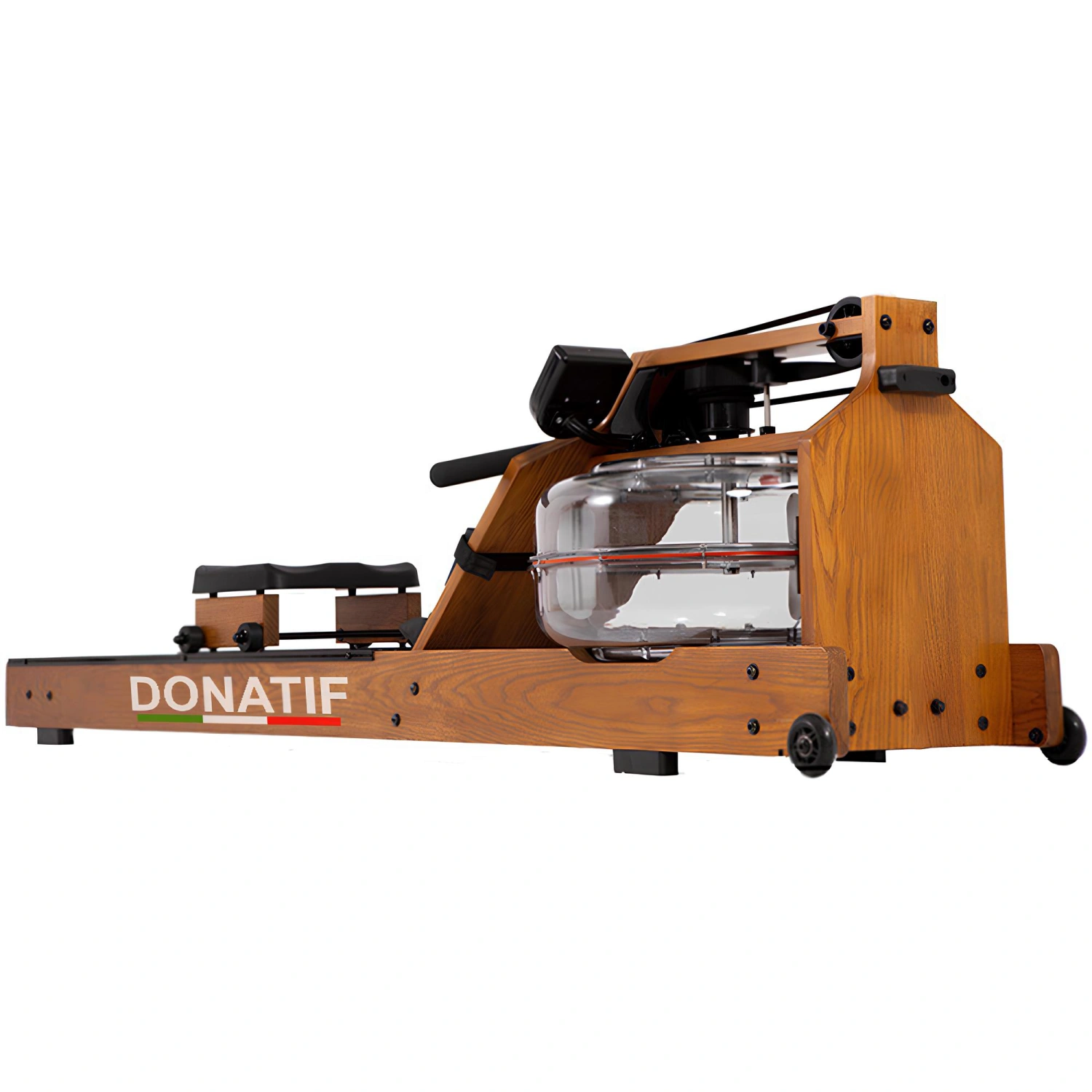 De plus, il est équipé d’un absorbeur d’eau électronique, qui assure un débit constant et régulier, et d’un système de purification de l’eau, conçu pour garder l’eau propre plus longtemps et améliorer les performances du réservoir. Le Bluetooth intégré vous permet de surveiller vos données en temps réel, ce qui rend chaque session plus immersive. Ces caractéristiques font du rameur une option polyvalente et innovante, parfaite pour ceux qui recherchent un entraînement fluide, efficace et performant. Le rameur à eau présente un design élégant avec un cadre en bois et des détails noirs, ce qui lui donne un look sophistiqué qui convient à tout environnement d’entraînement. Le réservoir d’eau orange abrite le système de résistance hydrodynamique. À l’intérieur, la lame d’entraînement jaune est conçue pour offrir un mouvement fluide et naturel, simulant un véritable aviron avec une efficacité maximale.