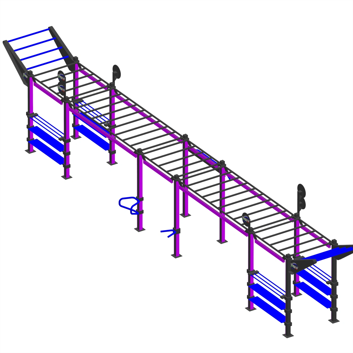 Les éléments qui composent cette structure forment un système linéaire extrêmement fonctionnel, conçu pour l’entraînement au poids du corps, le renforcement musculaire et le travail technique sur la traction, la coordination et la résistance. Sa configuration longue et modulaire se développe autour d’une séquence continue de barres de singe horizontales qui traversent toute la longueur de l’engin, offrant une progression fluide idéale pour l’entraînement OCR, l’entraînement militaire et la préparation athlétique fonctionnelle. Des deux côtés de la structure, il y a des rampes inclinées avec des barres horizontales, parfaites pour les exercices d’ascension en élan et de développement de la force explosive. En dessous de ces sections, nous trouvons des étagères de support et des surfaces d’appui, idéales comme étagères de rangement pour l’équipement ou comme zones de départ pour des itinéraires dynamiques. Des modules avec des supports mobiles, des anneaux, des piquets et des poignées verticales sont répartis le long de l’engin, ce qui permet d’alterner suspension et travail ciblé sur les épaules et les noyaux. Plusieurs cibles verticales sont intégrées sur les montants structurels, parfaites pour l’entraînement de précision et de vitesse, tandis qu’en bas, il y a des points d’ancrage visibles pour les cordes ou les cordes de combat, ce qui rend l’ensemble du système extrêmement complet pour un entraînement combiné de force et d’endurance.