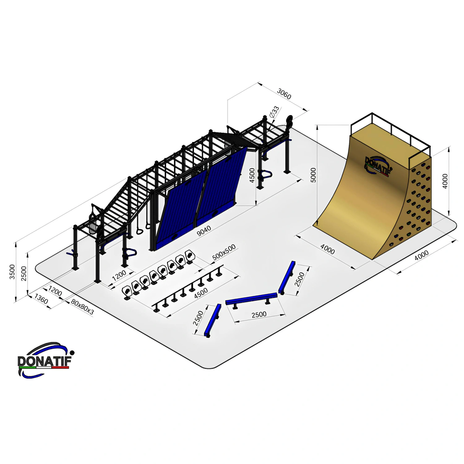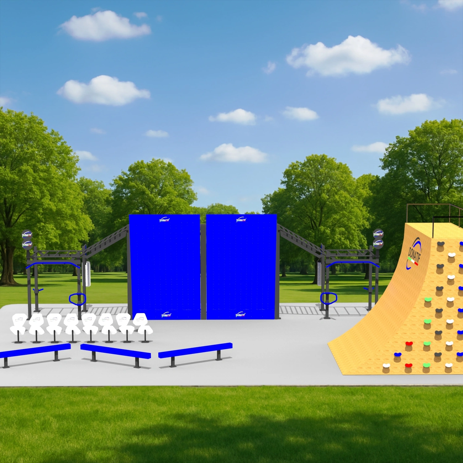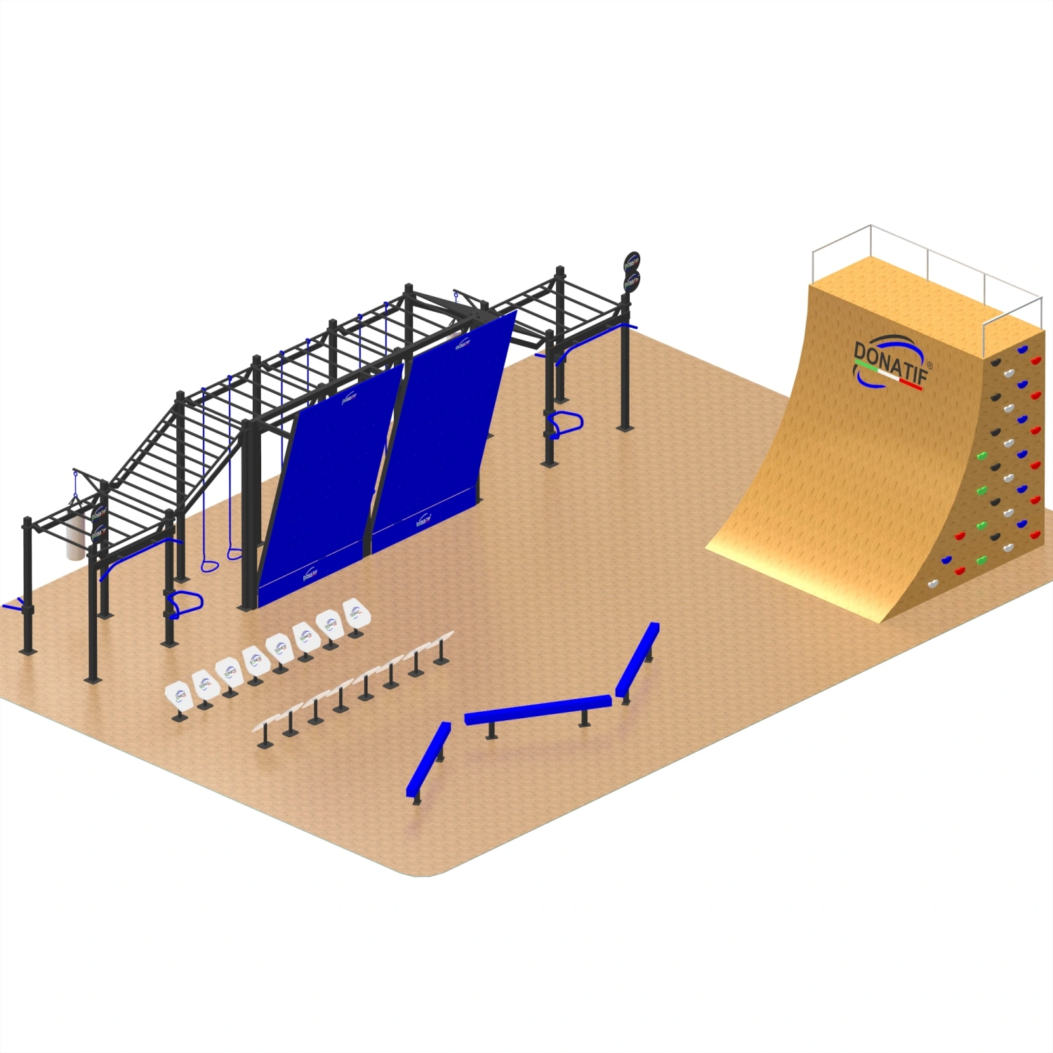 Indiquez les personnalisations que vous souhaitez et cliquez sur 'Enregistrer la personnalisation'La structure de gymnastique suédoise avec rampe - CH36 Donatif est fabriquée en acier à haute résistance avec un tube carré de 80x80x3 mm, traité par galvanisation à chaud et revêtement en poudre pour assurer une protection maximale contre les agents atmosphériques et l’usure. Les barres de traction ont une longueur de 120 cm et un diamètre de 33 mm, conçues pour offrir une prise en main sûre et confortable. Avec un poids total de 1300 kg, la structure se distingue par sa solidité et sa stabilité, assurant des performances et une fiabilité élevées même dans les utilisations les plus intensives. La valeur unique de cette installation de gymnastique suédoise réside dans la variété de ses éléments, qui permettent des entraînements complets et diversifiés. Parmi les composants principaux, nous trouvons les barres de singe et les barres transversales horizontales, parfaites pour les tractions, les balançoires et les trajectoires OCR ; les murs inclinés, qui offrent des exercices de puissance et d’escalade ; les sacs de soufflage intégrés, idéaux pour l’entraînement à l’explosivité et à l’endurance ; les barres parallèles et les bancs multifonctionnels, dédiés aux pompes, aux plongeons et aux planches ; La rampe Wall Run, qui met au défi l’agilité et la vitesse, s’enrichit d’un mur d’escalade avec des prises colorées pour améliorer la force et la coordination. Enfin, il y a aussi une zone d’haltères et des obstacles bas, utiles pour l’entraînement fonctionnel et les chemins d’équilibre. Grâce à cette combinaison d’équipements, la structure se prête à l’entraînement de gymnastique suédoise, à l’entraînement croisé, à la course d’obstacles et à l’entraînement athlétique multidisciplinaire. Il est idéal pour les installations dans les parcs publics, les zones de fitness urbaines, les écoles et les centres sportifs, devenant un centre de rassemblement sportif et social pour les utilisateurs de tous âges.
