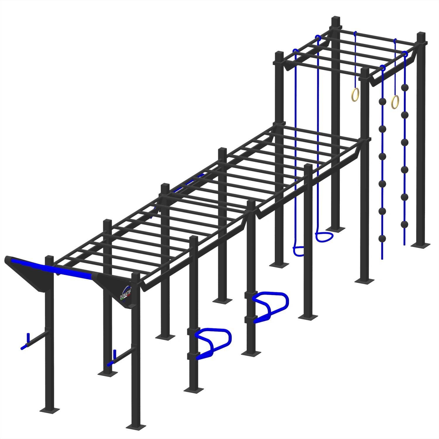Cette installation est conçue pour l’entraînement intensif OCR, l’entraînement fonctionnel et les courses d’obstacles. Commencez par une rampe oblique pour des montées dynamiques, suivie d’une longue barre de singe linéaire pour des exercices de force suspendue et d’endurance. Sur les côtés, deux parallettes permettent des plongeons et des mouvements de corps libre. Au centre, nous trouvons une série de boulets de canon suspendus pour l’entraînement à la préhension, des cordes verticales (lisses et bouclées) pour grimper et se balancer, et des anneaux de gymnastique pour les tractions et les muscle-ups. La partie finale comprend une cage avec des barres horizontales, idéale pour les tractions classiques et les stalles. Compact, technique et complet : parfait pour l’entraînement ninja, l’OCR et les préparations militaires.