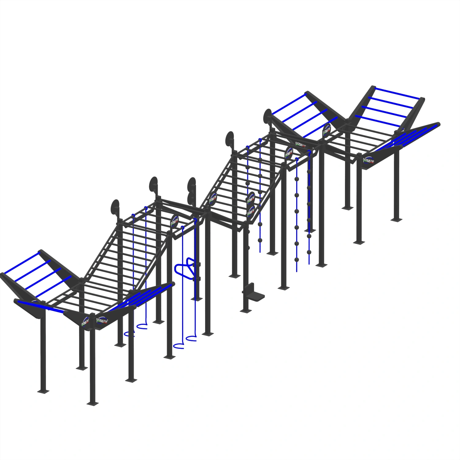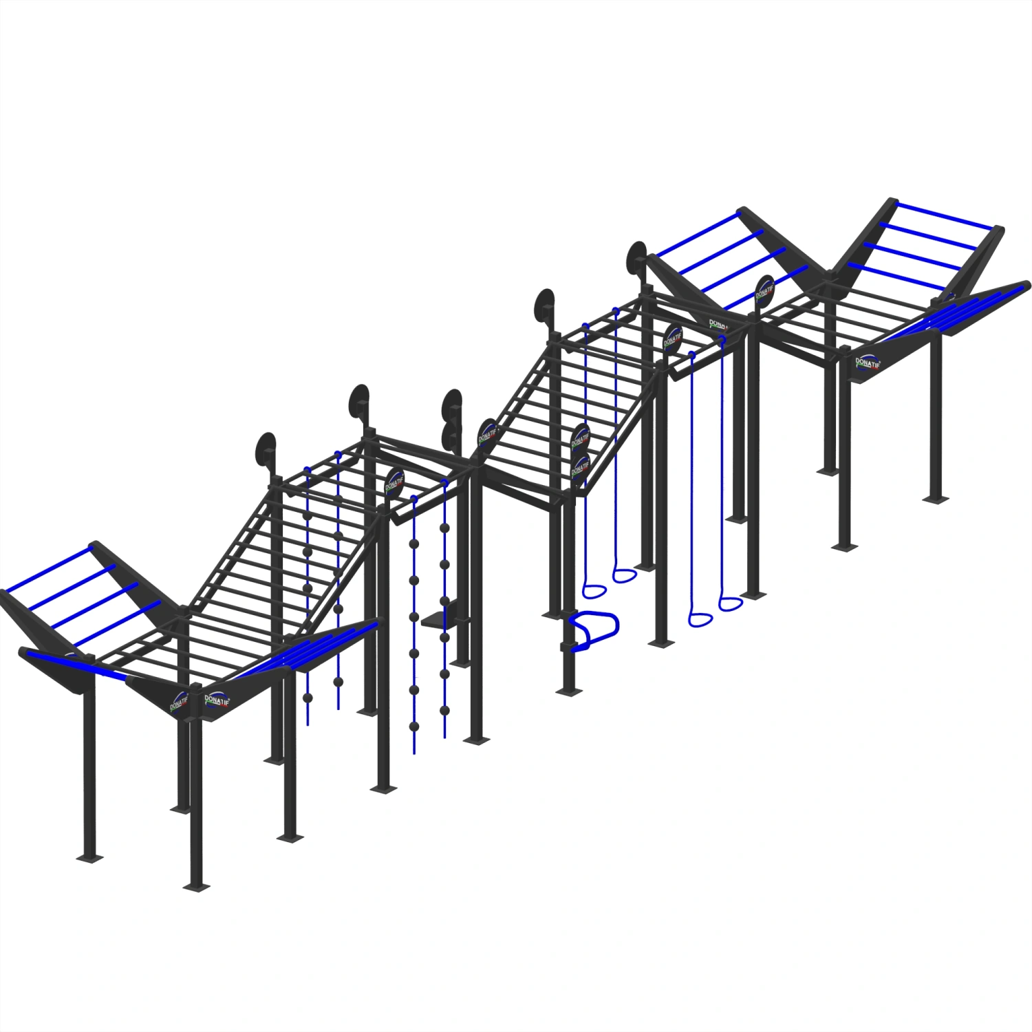 Cette structure multi-plates-formes est conçue pour offrir un parcours continu, technique et très difficile, parfait pour les athlètes OCR, fonctionnels, de gymnastique suédoise et de préparation ninja. Le gréement se développe en longueur avec une séquence de rampes inclinées avec des barres de singe obliques, idéales pour les exercices de montée et de descente qui améliorent la force explosive, la coordination et l’adhérence. Au centre, nous trouvons un escalier avec des échelons alternés et une barre centrale de singe avec des barres linéaires, parfaite pour les tractions, les transitions suspendues et les balançoires contrôlées. Il y a aussi plusieurs cordes verticales, lisses et annulaires, et une ligne de boulets de canon qui nécessitent précision, force de préhension et gestion dynamique du corps. La structure est complétée par des éléments fonctionnels tels que des poignées parallèles pour les dips, une station abdominale, des crochets latéraux pour les accessoires et de multiples cibles verticales conçues pour des exercices de saut, de frappe ou d’agilité. La conception modulaire et progressive rend cette installation idéale pour les cours OCR, les courses Ninja et l’entraînement en plein air de haute performance.