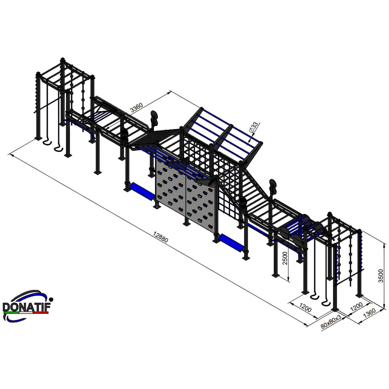 Indiquez les personnalisations que vous souhaitez et cliquez sur 'Enregistrer la personnalisation'La structure de gymnastique suédoise d’extérieur - CH21 est une structure de gymnastique suédoise professionnelle conçue pour offrir des performances élevées dans des contextes extérieurs, grâce à une construction en acier entièrement renforcée. Son architecture solide et imposante est faite de tubes carrés de 80x80x3 mm, traités par galvanisation à chaud pour une résistance maximale aux agents atmosphériques, suivis d’un revêtement en poudre qui garantit la durabilité et une finition de haut niveau. Avec une profondeur de 1288 cm, une largeur de 136 cm et une hauteur structurelle de 350 cm, cette solution se présente comme une plate-forme complète et robuste pour l’entraînement au poids du corps. Le poids total de la structure est de 900 kg, synonyme de stabilité même sous des contraintes intenses. Les barres de traction de 120 cm de long et d’un diamètre de 33 mm sont conçues pour offrir une prise en main solide et confortable, adaptée à tous les niveaux d’athlète. Le design standard a une finition noire et bleue, mais des couleurs et des détails entièrement personnalisables sont disponibles sur demande.