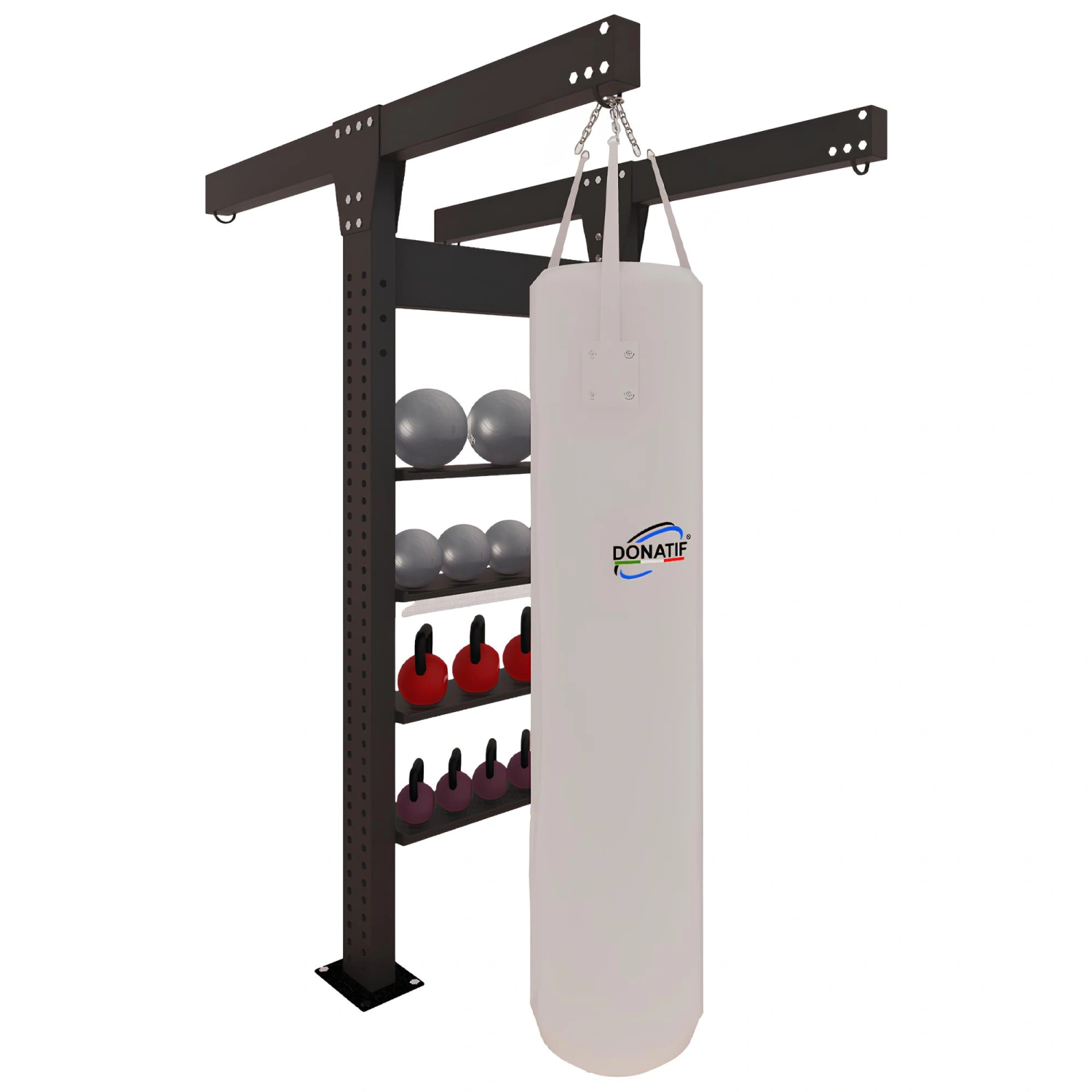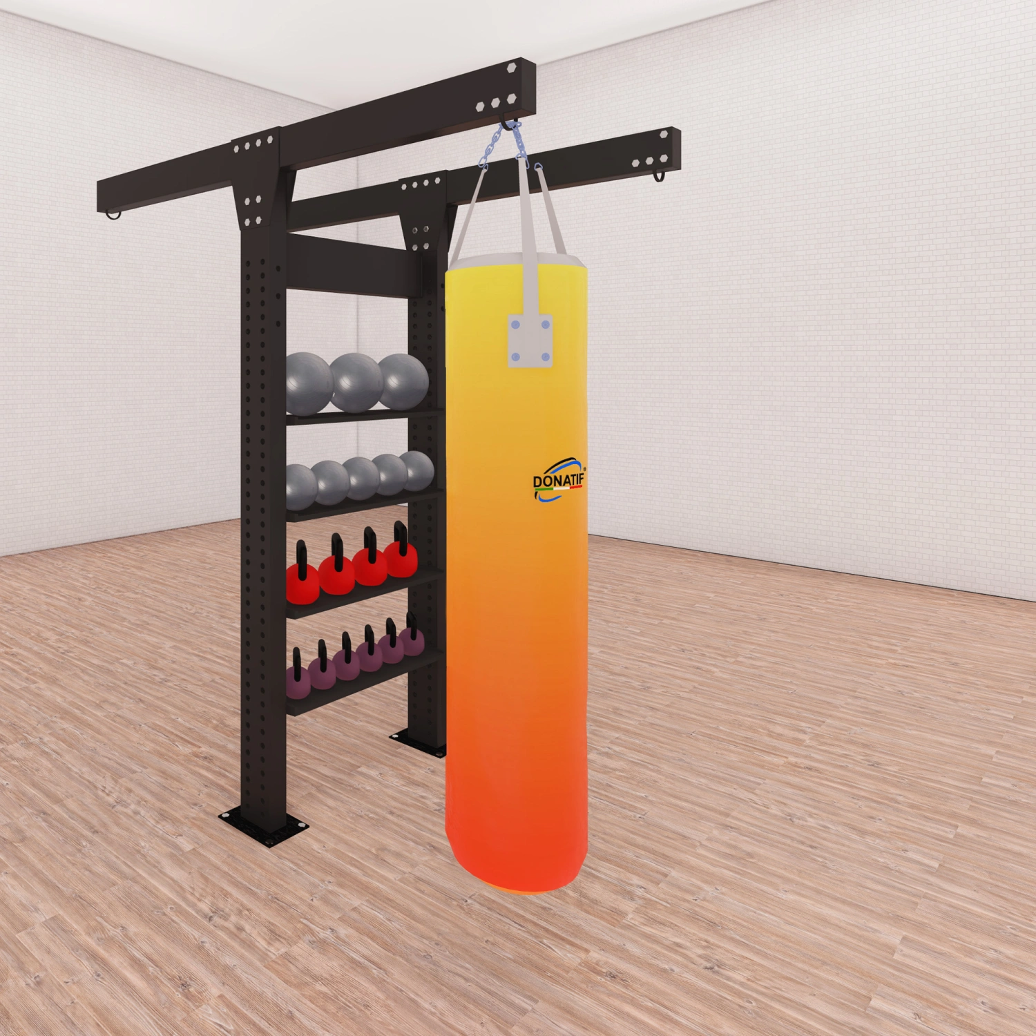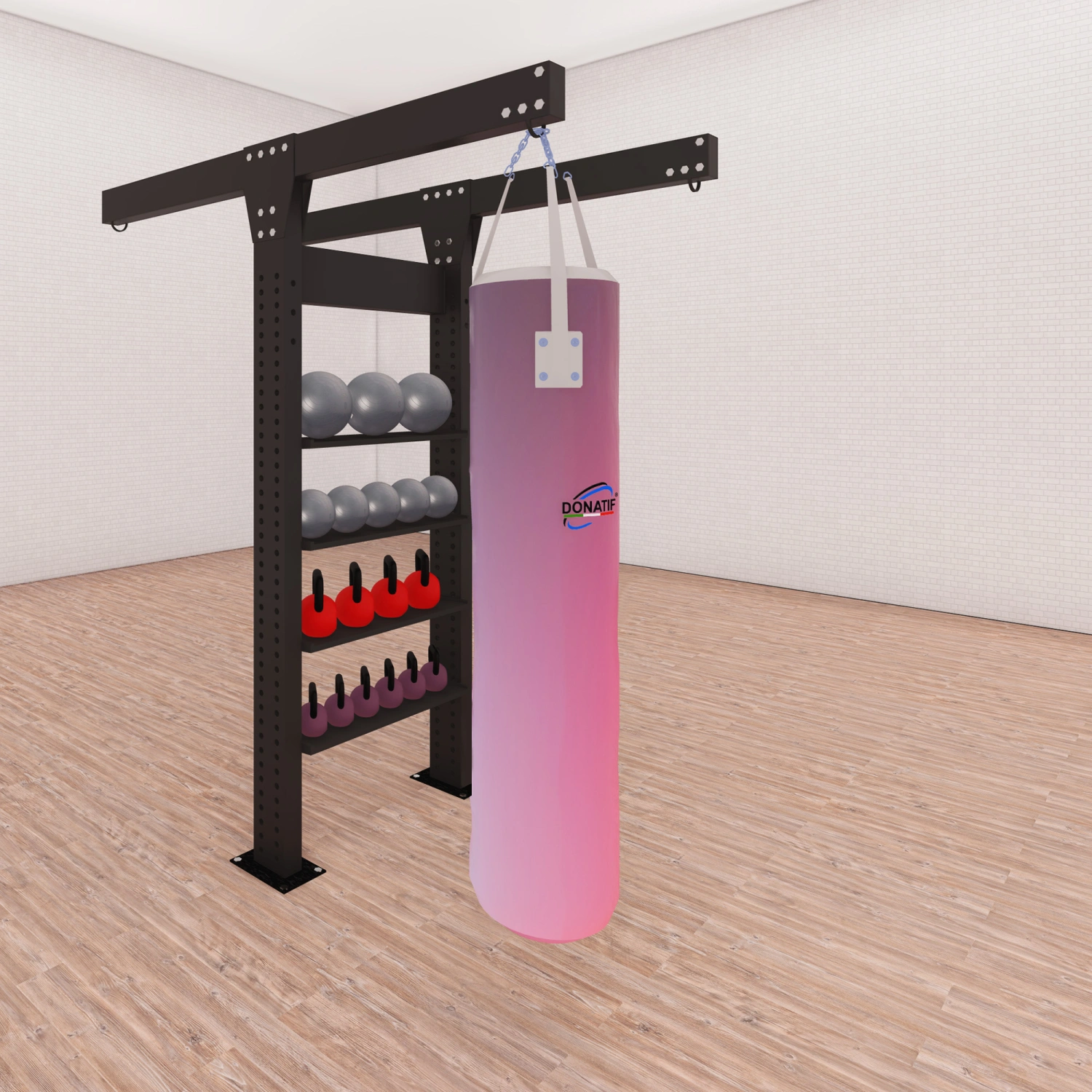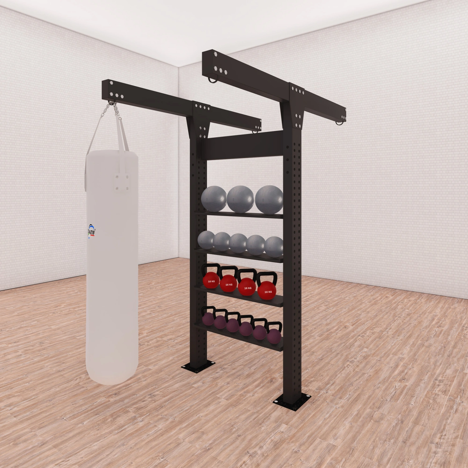 Inclus avec la structure, vous trouverez un sac de boxe personnalisable en taille et en poids, fermement fixé à la structure. Il est possible de demander jusqu’à 3 sacs supplémentaires, ce qui rend la station modulaire en fonction des besoins de l’utilisateur ou du centre sportif. La couleur de la structure et du sac est entièrement personnalisable, avec la possibilité d’insérer le logo de votre marque de gym ou de sport pour un look totalement sur-mesure. La fixation au sol est nécessaire pour assurer la sécurité et la stabilité, et s’effectue à l’aide de chevilles incluses dans la fourniture.