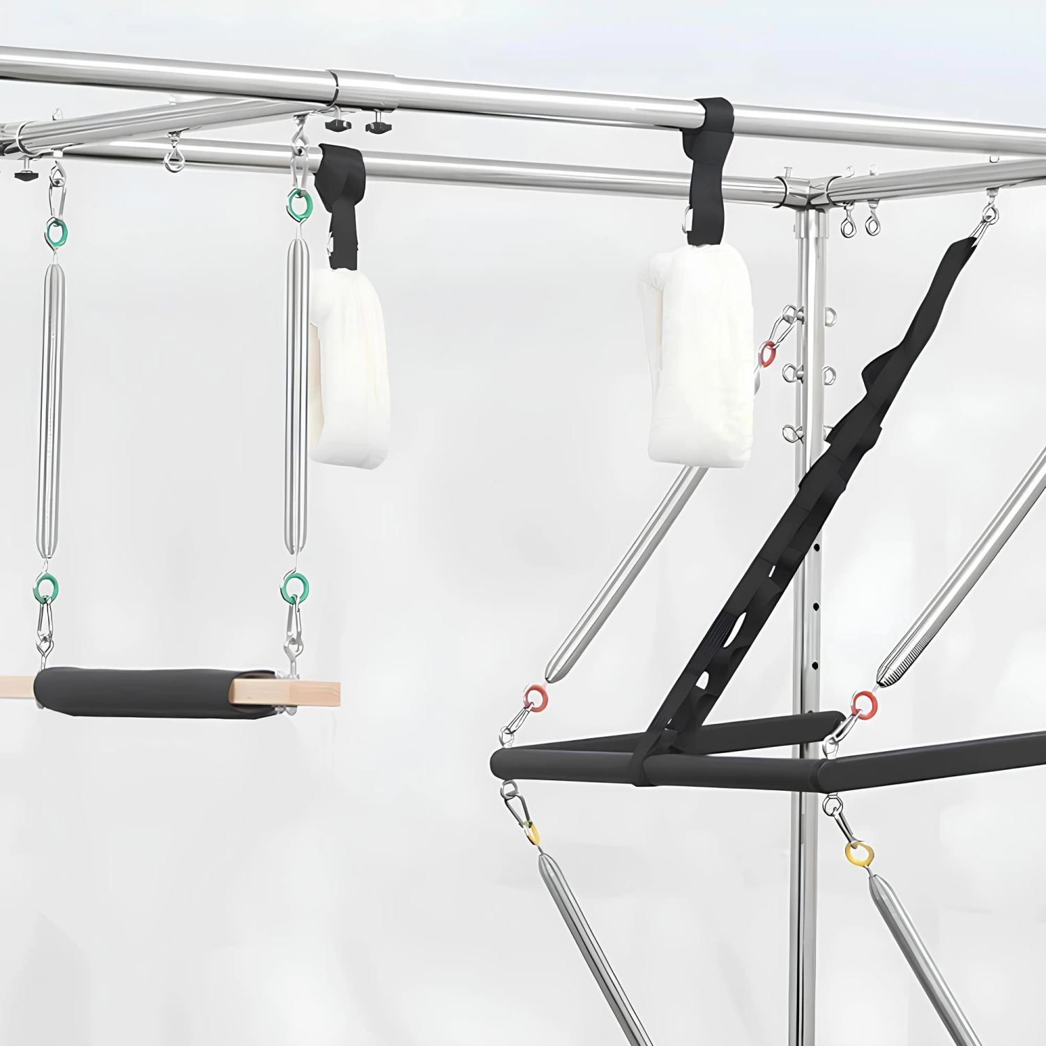 La barre de trapèze suspendue, associée aux ressorts réglables et aux différentes poignées, permet une grande variété de mouvements : étirements, renforcement musculaire, exercices de mobilité articulaire, jusqu’au travail de résistance progressif.
