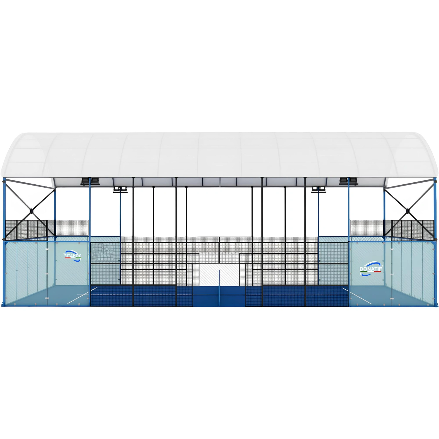 Le terrain de padel intérieur est une installation professionnelle conçue pour assurer des performances élevées dans toutes les conditions météorologiques. L’ensemble de la couverture est en PVC double face de 750 g/m², solide et durable, idéal pour une utilisation intensive et continue.