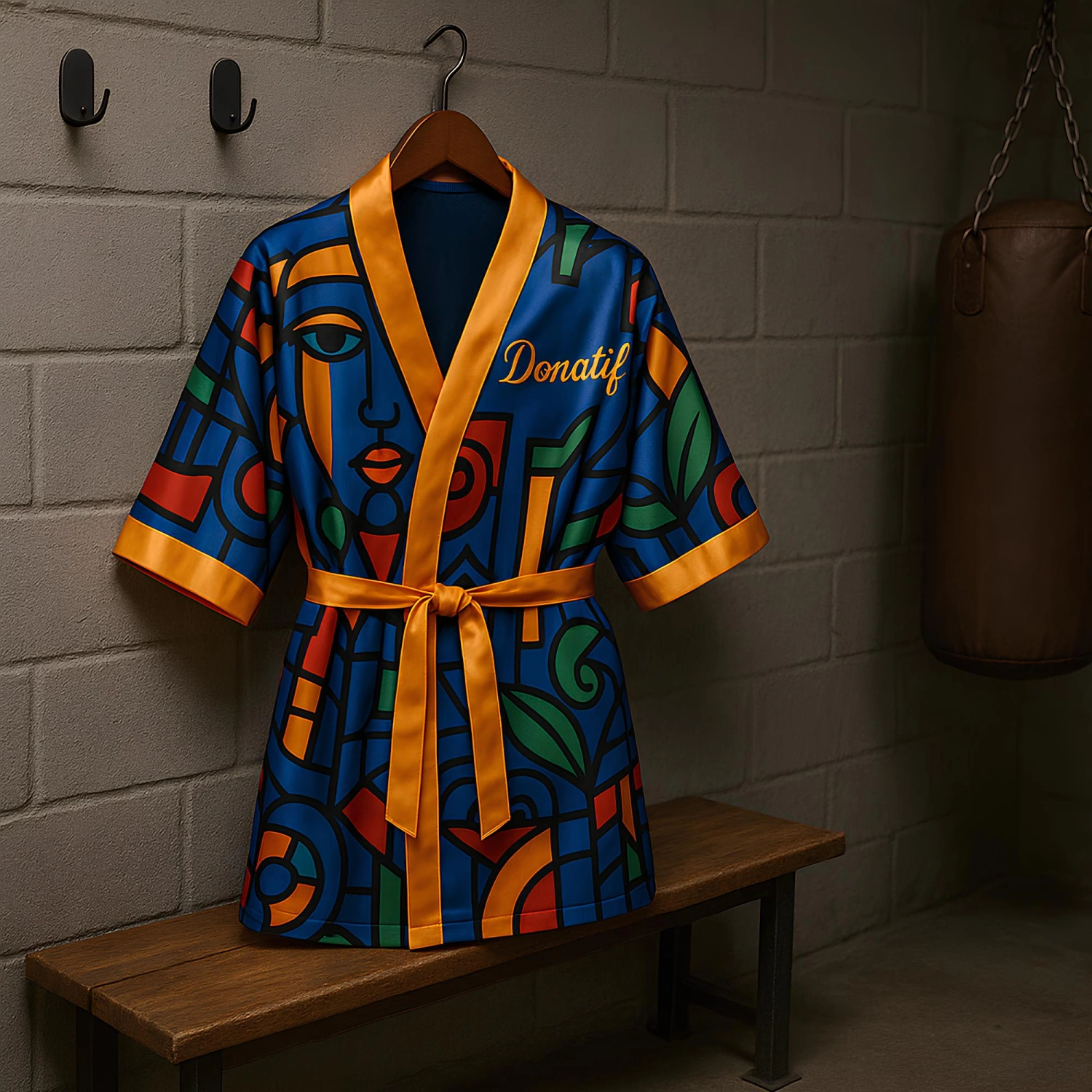 La Robe Anneau - Style Mural - VR5 se porte par-dessus les vêtements de compétition, devenant une extension visuelle et identitaire de l’athlète. Sa présence scénique est parfaite pour les moments précédant le match, pour l’entrée triomphale sur le ring ou pour garder les muscles au chaud entre les rounds. La capuche dorée ajoute du drame à l’entrée, tandis que la ceinture assure un ajustement parfait et une facilité de mouvement. Les poches latérales sont fonctionnelles à la fois pour l’athlète et l’entraîneur, offrant de l’espace pour les petits objets. En plus de l’utilisation compétitive, il convient également aux séances photo, aux événements sportifs et aux occasions de style de vie où vous souhaitez affirmer une identité forte et incomparable.
