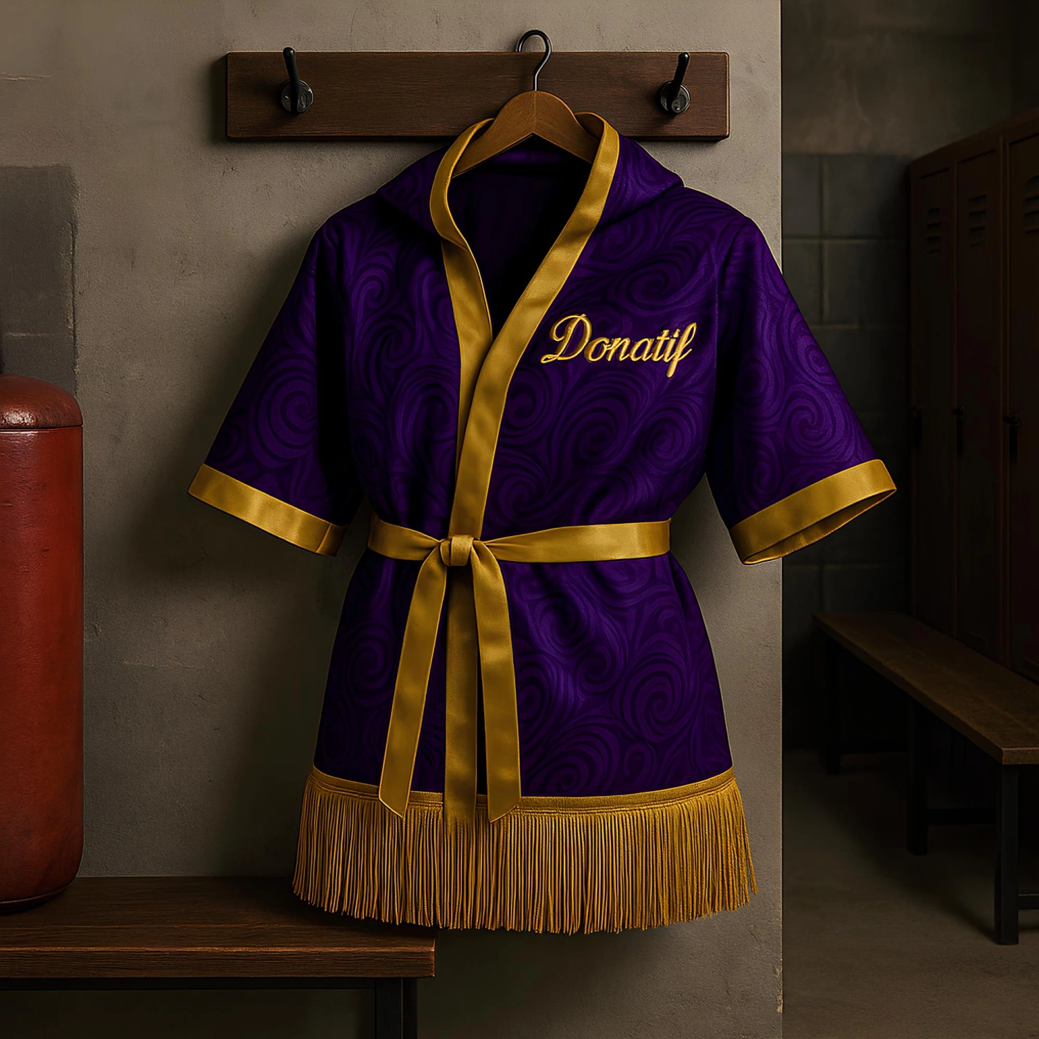 Indica le personalizzazioni che desideri e premi su 'Salva Personalizzazione'Realizzato interamente in raso 100% con cuciture rinforzate e rifinito con una lavorazione sartoriale di altissimo livello, l’Accappatoio da Ring - Design Maori - VR4 unisce la raffinatezza dell’estetica tribale all’efficienza tecnica di un capo sportivo professionale. Il taglio è quello classico dei grandi match internazionali: lunghezza 3/4 appena sopra il ginocchio, maniche corte in stile pro e una linea pensata per valorizzare la fisicità dell’atleta durante il suo ingresso sul ring. I dettagli dorati, le frange sul bordo inferiore e i motivi Maori tono su tono elevano il carattere scenografico della vestaglia. Una scelta distintiva per chi vuole impressionare ancor prima che inizi il combattimento.