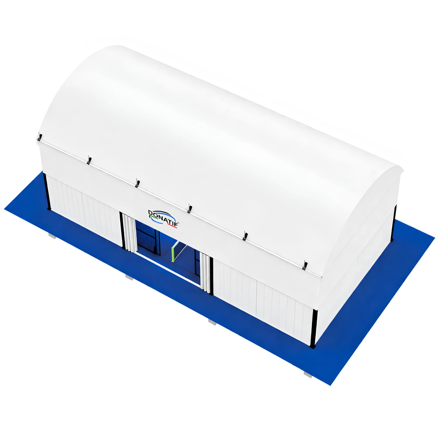 Le altezze differenziate (6 m ai lati, 8,8 m al centro) consentono una copertura curva funzionale e ben ventilata. La copertura in PVC doppio rivestito da 750 g/m² garantisce una protezione totale da pioggia, vento e raggi UV. Le pareti laterali da 550 g/m², opzionali, possono essere installate su binari scorrevoli, offrendo flessibilità nell’utilizzo e una chiusura completa quando necessario.