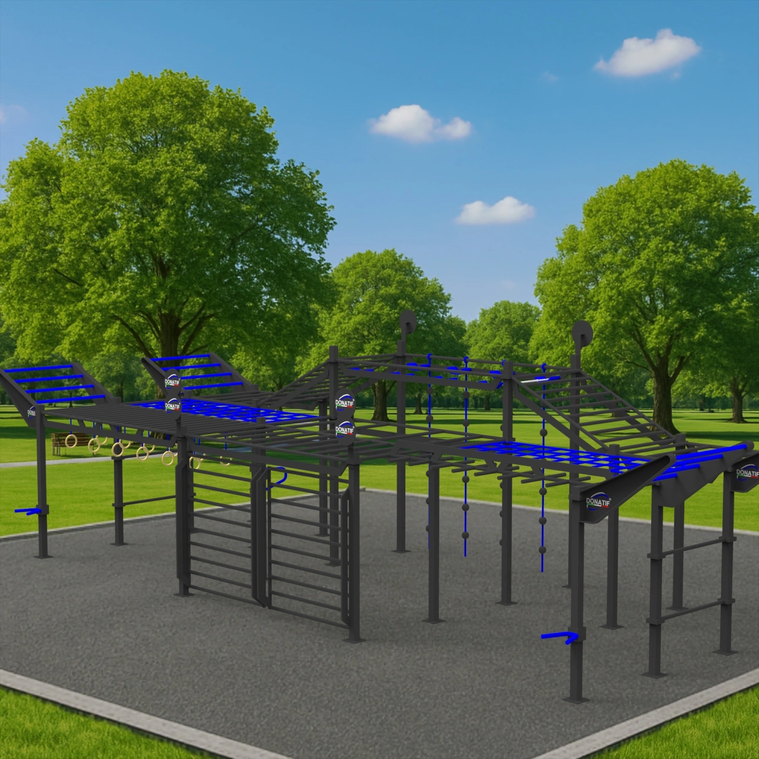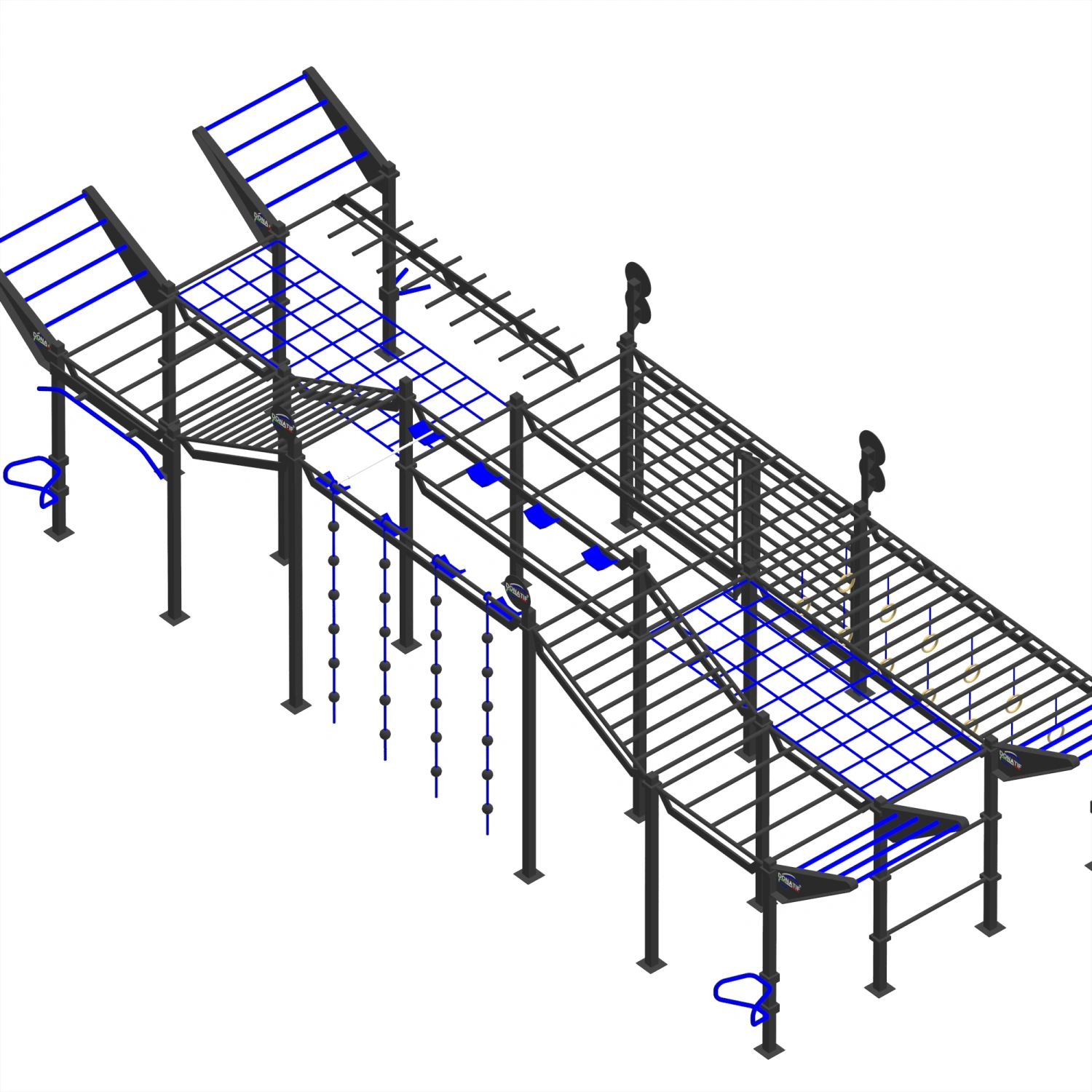 Questa struttura è un percorso completo e multilivello pensato per l’allenamento a ostacoli in stile ninja e OCR, con una configurazione progettata per mettere alla prova forza, agilità, coordinazione e resistenza. Il rig presenta tre rampe inclinate con monkey bars in posizione ascendente e discendente, perfette per esercizi di spinta, trazione e mobilità in sospensione. Le rampe conducono a piattaforme intermedie collegate da reti orizzontali in acciaio, ideali per arrampicata a corpo libero o passaggi in quadrupedia sospesa. Tra un modulo e l’altro sono integrate diverse sezioni con maniglie mobili, loop sospesi, sfere da presa, corde verticali con nodi e anelli da trazione, elementi che richiedono equilibrio, tecnica e forza isometrica. Una caratteristica centrale della struttura è la presenza di griglie laterali verticali, che fungono sia da pareti di arrampicata sia da sostegno per esercizi di transizione tra piani differenti. Alcuni segmenti sono arricchiti con barre orizzontali multiple, ideali per trazioni esplosive, tecniche di swing e test di endurance. Completano il percorso i moduli con bersagli verticali e supporti per accessori, pensati per integrare esercizi a corpo libero, stazioni di precisione e lavori combinati con corde o elastici (non inclusi). La simmetria e modularità rendono questa struttura perfettamente adattabile a spazi outdoor, per sessioni individuali o training di gruppo. Il design Donatif unisce funzionalità e performance in una struttura adatta a professionisti dell’OCR, centri fitness evoluti e training camp militari. Ogni elemento è studiato per creare un’esperienza immersiva e progressiva, in grado di stimolare ogni aspetto della preparazione fisica.