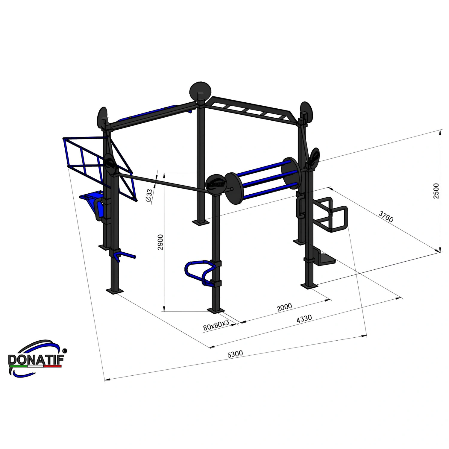 Indica le personalizzazioni che desideri e premi su 'Salva Personalizzazione'La Struttura Calisthenics Esagonale - CH51 è una stazione di allenamento outdoor progettata per garantire solidità, versatilità e lunga durata. Costruita in acciaio con tubo quadro da 80x80x3 mm, trattata con zincatura a caldo e verniciatura a polvere, assicura resistenza agli agenti atmosferici e un utilizzo costante nel tempo. Le dimensioni – 433 cm di profondità, 376 cm di larghezza e 250 cm di altezza – unite a un peso di 180 kg, la rendono una struttura stabile e sicura in qualsiasi contesto. Le barre per trazioni da 120 cm, con diametro di 33 mm, offrono prese comode e affidabili, mentre le scale orizzontali e verticali stimolano movimenti dinamici e lavori in sospensione. Le aree inclinate e i supporti dedicati a elastici e accessori ampliano le possibilità di allenamento, creando una piattaforma completa per forza, coordinazione e resistenza.