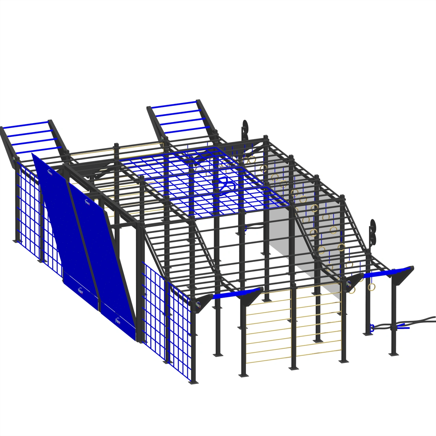 Questa struttura obstacle & ninja training è un impianto compatto ma estremamente completo, progettato per allenamenti intensi e versatili. Comprende pareti inclinate da superare in salita, una parete da arrampicata con appigli colorati, e una rete verticale per l'arrampicata frontale. Al centro si sviluppa una grande gabbia con monkey bars lineari e incrociate, anelli sospesi e moduli con corde, tutti pensati per esercizi di grip, coordinazione e forza. Sono inoltre presenti scale inclinate, piattaforme di partenza, dischi oscillanti e corde per trazione. Ideale per OCR, preparazione atletica e ninja training, questa struttura offre una varietà di ostacoli in un'unica soluzione modulare e professionale.