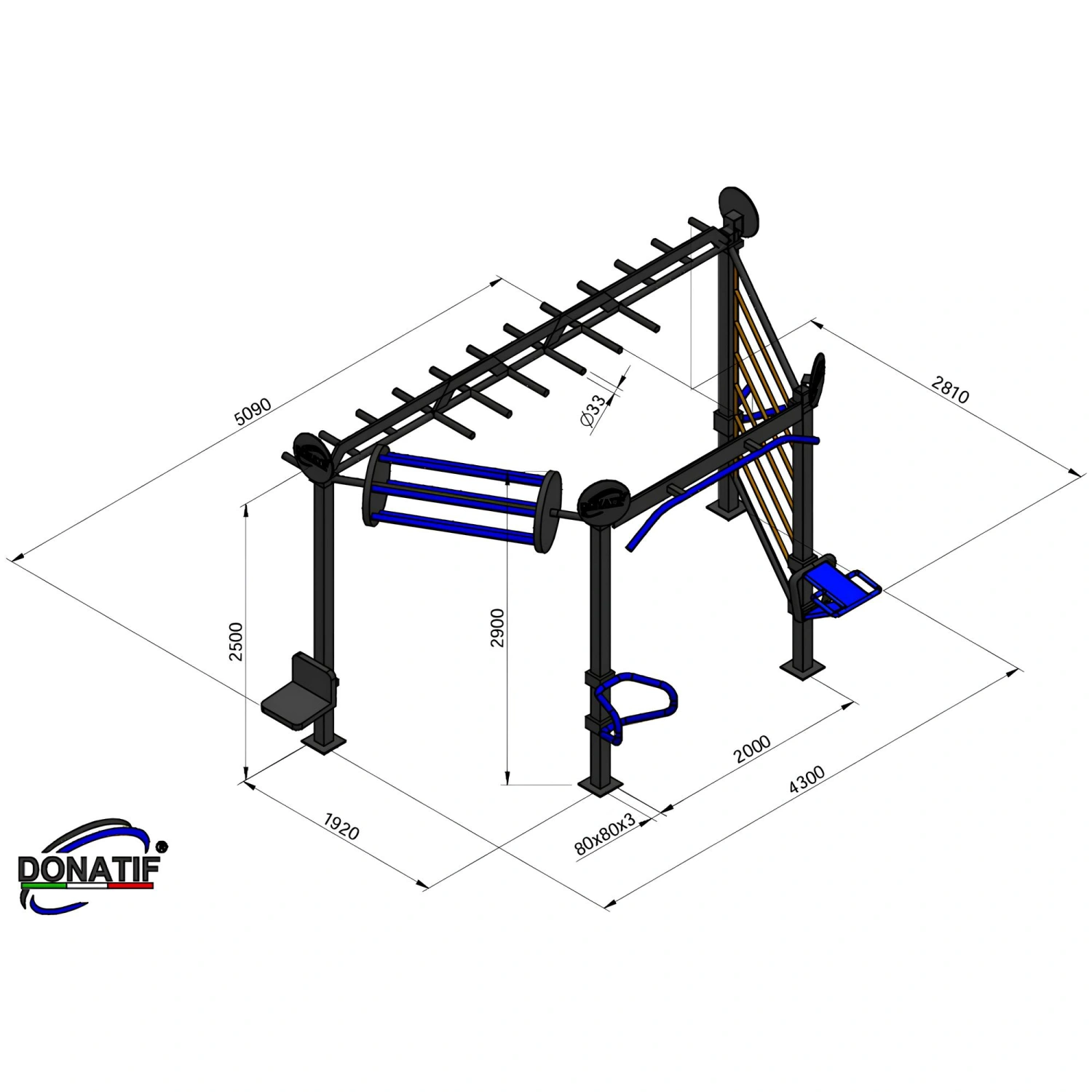 Indica le personalizzazioni che desideri e premi su 'Salva Personalizzazione'La Struttura con Scala Verticale - CH53 è una stazione di allenamento outdoor compatta ma altamente funzionale, progettata per offrire numerose possibilità di esercizio in un unico modulo. Costruita in acciaio con tubo quadro 80x80x3 mm, è trattata con zincatura a caldo e verniciatura a polvere, che la rendono resistente e durevole nel tempo, anche in condizioni climatiche difficili. Le sue dimensioni – 509 cm di profondità, 281 cm di larghezza e 290 cm di altezza, per un peso complessivo di 150 kg – garantiscono stabilità e sicurezza in ogni utilizzo. La struttura integra barre per trazioni da 120 cm con diametro di 33 mm, una spalliera verticale per esercizi di mobilità e potenziamento, una scala orizzontale inclinata per lavori di sospensione e coordinazione, oltre a supporti laterali e accessori dedicati che ampliano la varietà di allenamento.
