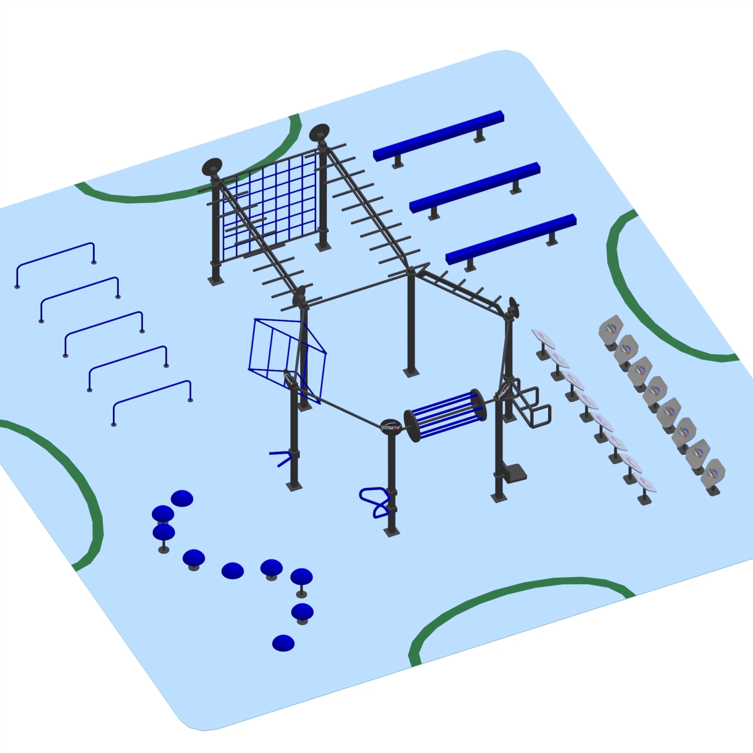 Indica le personalizzazioni che desideri e premi su 'Salva Personalizzazione'Il Struttura per Aree Fitness Outdoor - CH75 è una struttura outdoor completa e imponente, progettata per offrire un’esperienza di allenamento che unisce forza, agilità e resistenza in un unico spazio. Ogni elemento è stato scelto per creare un percorso vario e stimolante: le spalliere verticali a rete favoriscono arrampicate e trazioni, i monkey bar estesi permettono esercizi di sospensione e percorsi dinamici, mentre i moduli inclinati e sagomati aggiungono complessità e nuove sfide all’allenamento. Le barre parallele e sagomate permettono di lavorare su tricipiti, pettorali e core, mentre gli step pod multipli e le panche di equilibrio stimolano agilità, stabilità e coordinazione. La struttura è realizzata in acciaio con tubolari da 80x80x3 mm, trattata con zincatura a caldo e verniciatura a polvere, per resistere a qualsiasi condizione climatica. Le dimensioni – profondità 1400 cm, larghezza 1300 cm e altezza 290 cm – insieme a un peso complessivo di 1100 kg, garantiscono robustezza e stabilità, mentre le barre da trazioni (120 cm di lunghezza e 33 mm di diametro) offrono la presa ideale per allenamenti intensivi e professionali.