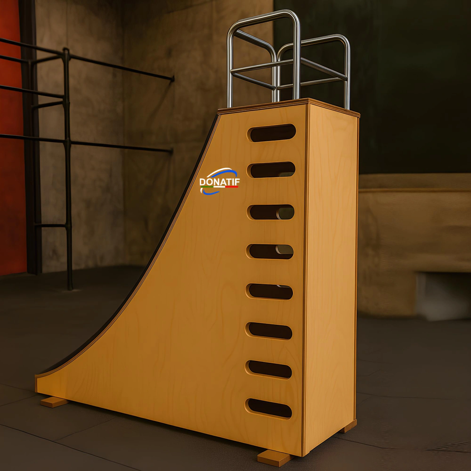 Il Warped Wall in Legno per Allenamento Donatif può essere installata sia in ambienti interni che in spazi coperti attrezzati, preferibilmente su superficie piana, stabile e ben fissata. In un contesto indoor è ideale all’interno di palestre specializzate in parkour/free‑running o spazi funzionali dedicati alla ginnastica acrobatica; all’aperto, seppur protetta da agenti atmosferici, può funzionare come modulo in un percorso a ostacoli o training camp.